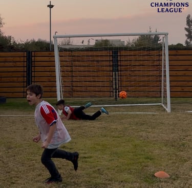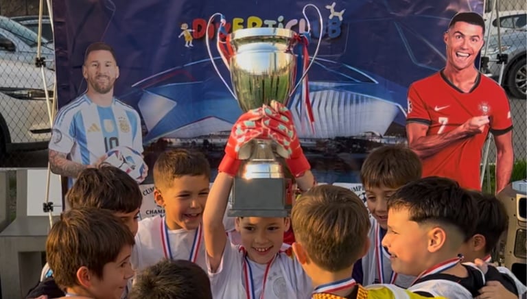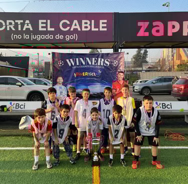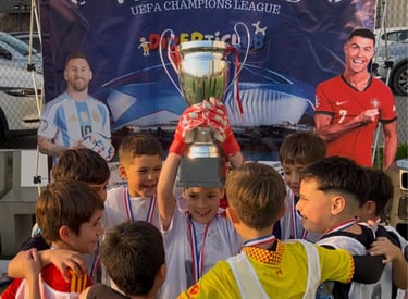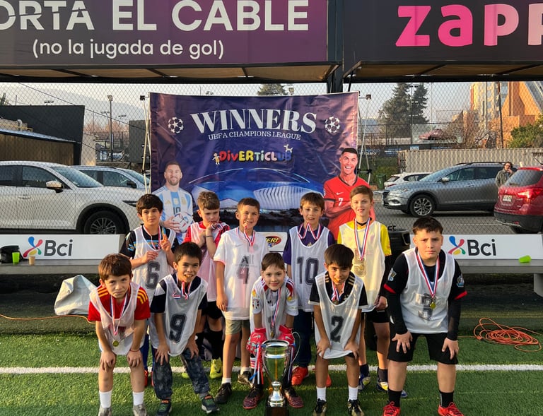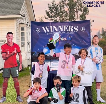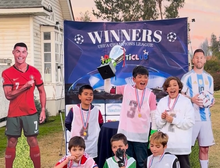 Animadores expertos recrean un torneo estilo Champions con entrega de medallas, música y emoción.
